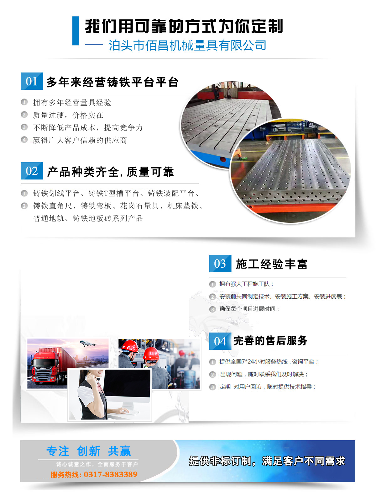 泊頭市佰昌機械量具有限公司坐落在有“鑄造之鄉”美稱的泊頭市,我公司自創(chuàng)建初期堅持誠信原則和不斷創(chuàng)新的原則,_為廣大用戶提供鑄鐵平板,鑄鐵地板,劃線平臺等放心產品,我們的產品_程度高,得到了廣大用戶的高度認可。